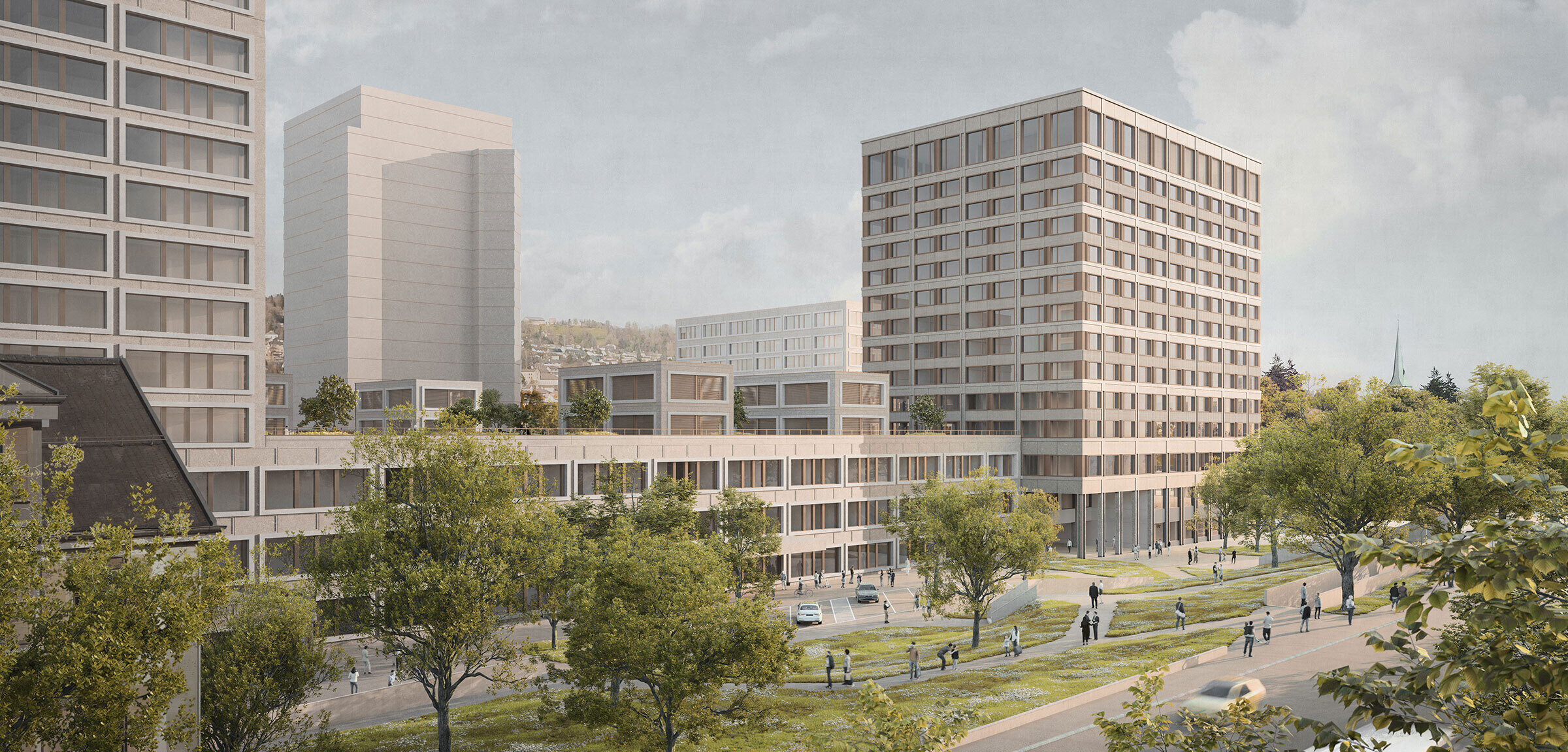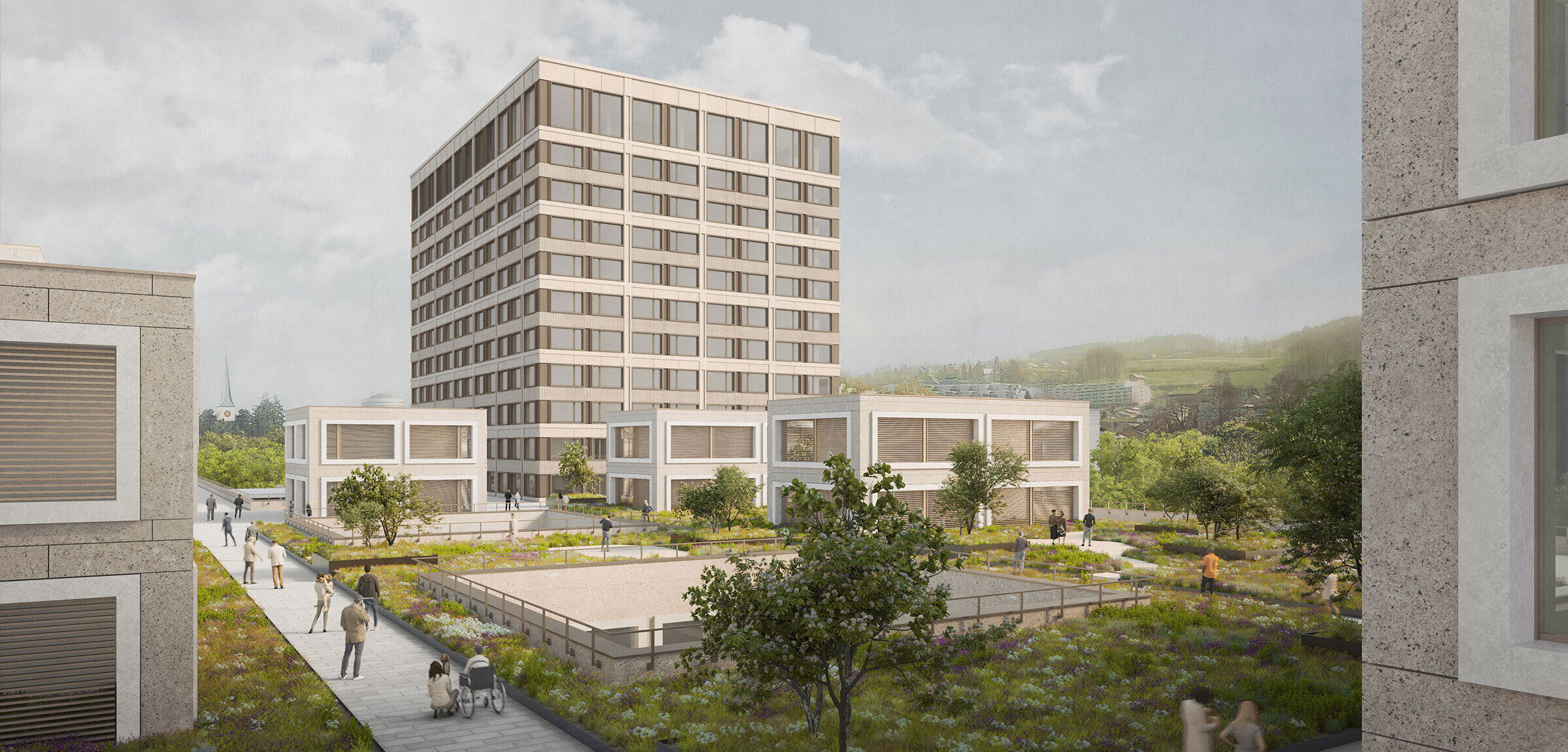 Die Gesamtkomposition des Neubaus für das Kantonsspital St.Gallen zeichnet sich durch die Setzung von drei neuen Hochpunkte aus, die durch einen dreistöckigen Sockelbau zu einem funktionalen und baukörperlichen Ensemble verbunden werden. Dessen Dach bildet einen wesentlichen Teil des neuen Spitalaussenraumes; dient der Verbindung zwischen den einzelnen Häusern und ist attraktiver Aufenthaltsort für Patient:innen und Mitarbeitende.