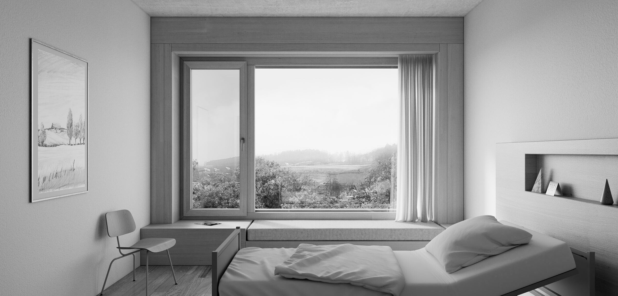 Nach sorgfältiger Analyse der Vorgaben bzgl. Raster und Teilung haben wir uns entschlossen das vorgegebene Grundraster von 8.10m an den Stirnseiten des Perimeters auf ein Halbraster zu reduzieren und damit das Raster innerhalb des Perimeters auch um dieses Mass gegenüber den Vorgaben zu schieben. Ansonsten werden die 8.10m jedoch überall beizubehalten. Durch den zentrisch gesetzten Kern ergibt sich eine grösstmögliche, gegenüber den Schemastudien wesentlich flexibler nutzbarer umlaufende Nutzschicht mit Tageslichtbezug. Diese Adaption ermöglicht nicht nur den Wechsel der Stützensetzung in der Passage von einer mittig gesetzten Stützenreihe auf zwei lateral gesetzte Stützenreihe, sondern bietet auf der Längsseite auch in den Obergeschossen grosse Vorteile. So ermöglicht die Setzung eine stirnseitige Anordnung von weniger tief geschnittenen Einzelzimmern, welche den Raumbedarf funktional und flächenmässig sehr effizient abbilden. In Querrichtung ermöglicht der Stützenraster von 8.10m die beidseitige Anordnung von Einzel- oder Zweierzimmern sowie von Stützpunkten und weiteren Serviceräumen. Mit dieser sehr effizienten Struktur kann das Achsraster von 4.05m für alle Patientenzimmer beibehalten werden und auf ein funktional problematisches Untermass verzichtet werden. Zugleich sichert die Fenstergliederung im Element auch die Teilung in Raumeinheiten von 2.70m im Bereich von möglichen Büro- und Ambulatoriumsflächen.