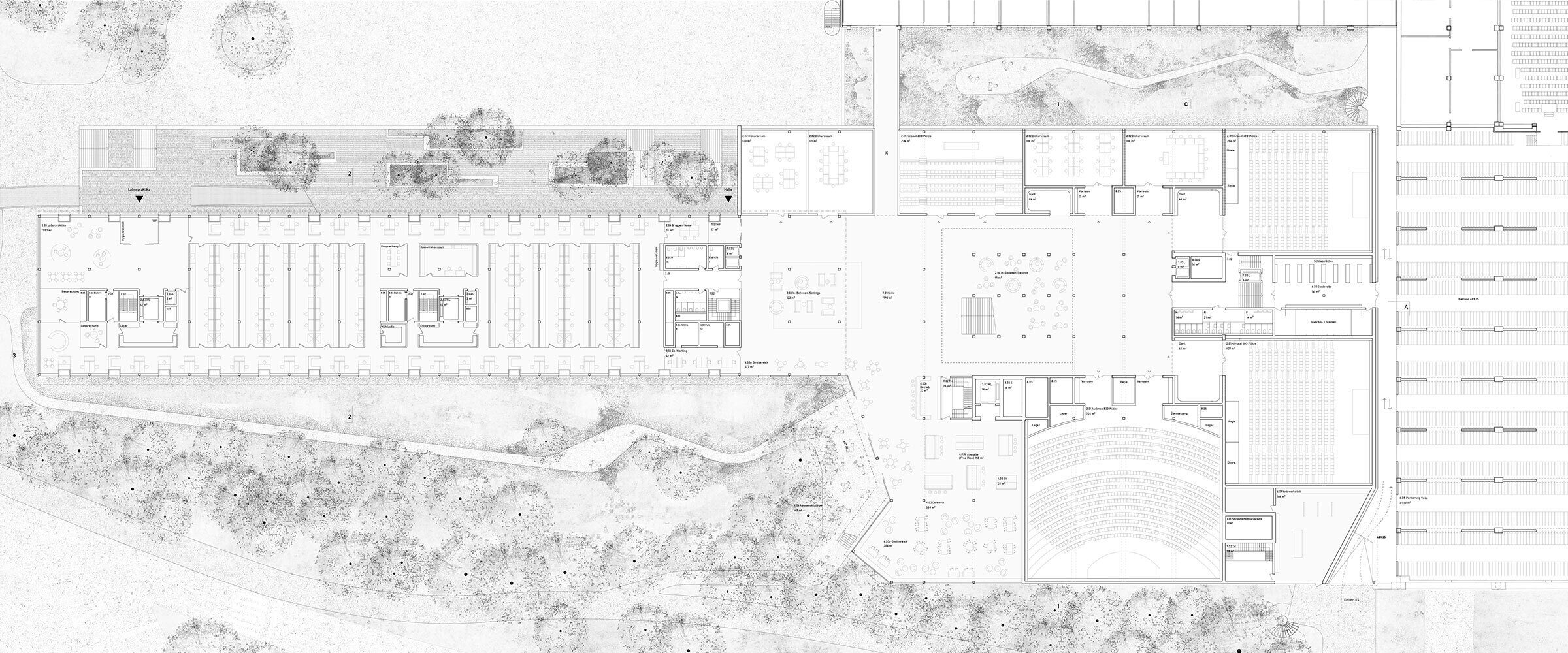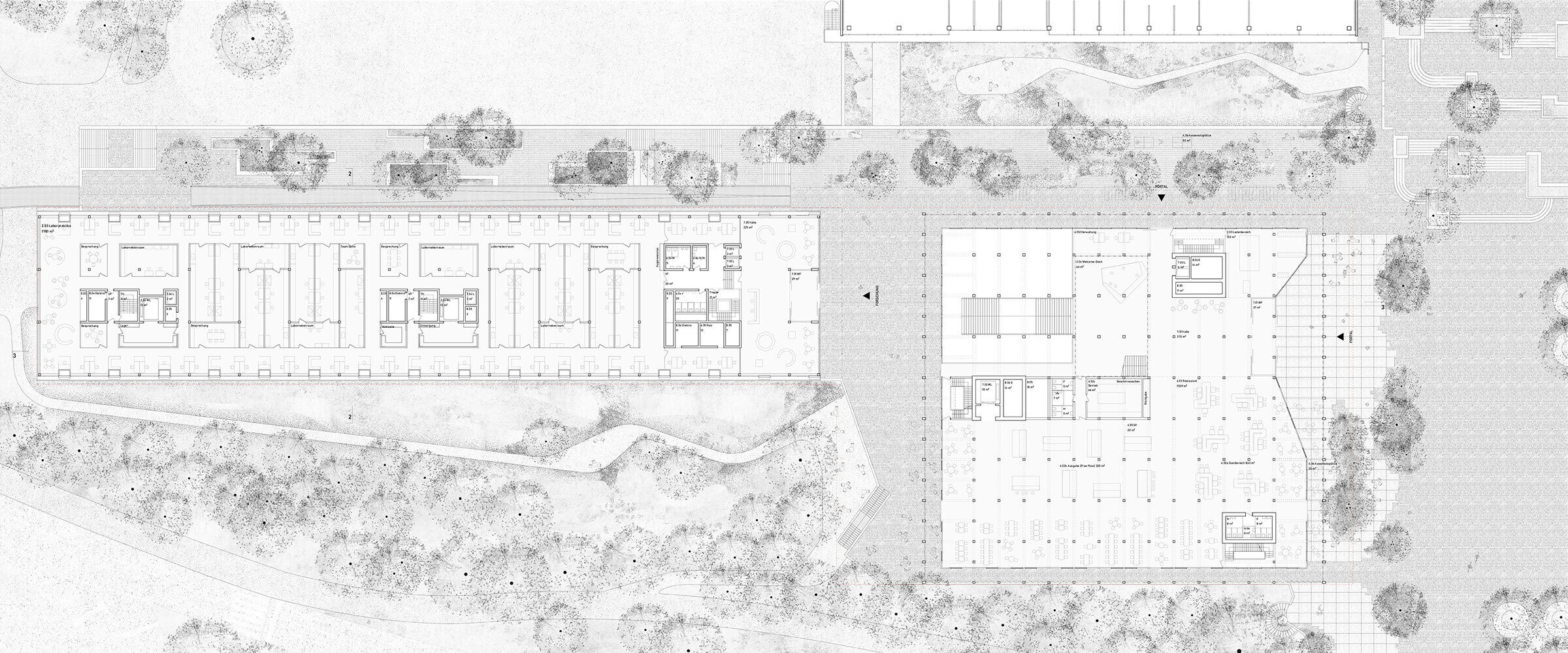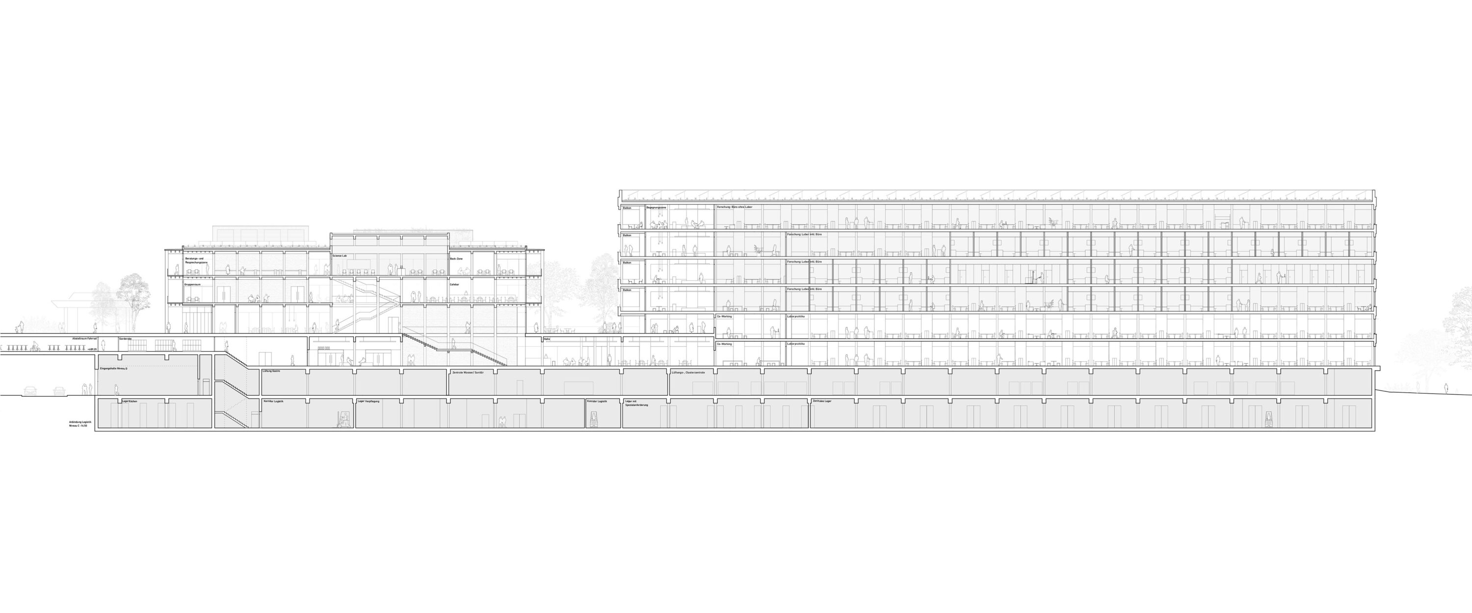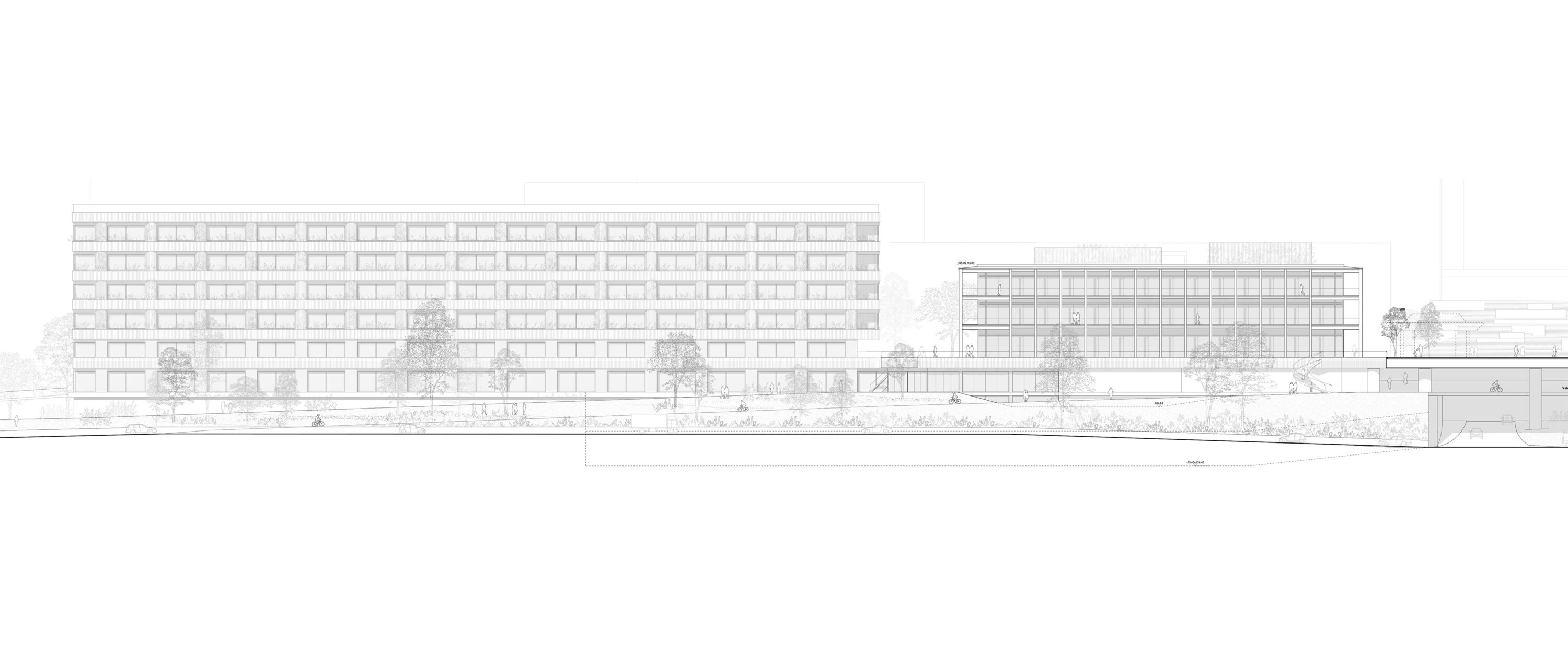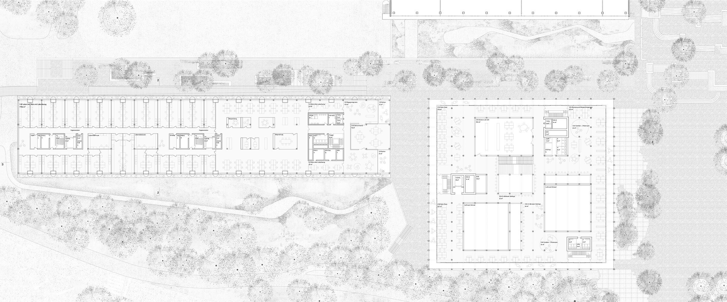 Das Projekt schlägt eine Komposition zweier in Volumetrie und architektonischem Ausdruck stark differenter Bauten vor. Es orientiert sich an der Gebäudeanordnung der vorangegangenen Testplanung und greift durch die Trennung des Forschungs- und Lehrgebäudes in zwei Volumen den Massstab der Bestandsbauten auf. Die Neubauten Y10 und Y51 bilden den unteren Abschluss zur Kantonsstrasse. Aufgrund seiner Lage und seiner öffentlichen Nutzungen wird das nahezu quadratische Gebäude Y10 zu einem Orientierungspunkt und einer Adresse für den gesamten Campus. Zur Promenade hin tritt es dreigeschossig in Erscheinung und etabliert ein starkes Gegenüber zum Staatsarchiv. Es bildet einen Kontrast zu den gerichteten Längsbauten, die das vorhandene Bebauungsmuster prägen. Trotz der peripheren Lage befindet sich hier das zukünftige Zentrum eines in seiner strukturalistischen Anlage eigentlich zentrumslosen Campus. Das Gegenstück dazu bildet das langgestreckte Laborgebäude Y51.