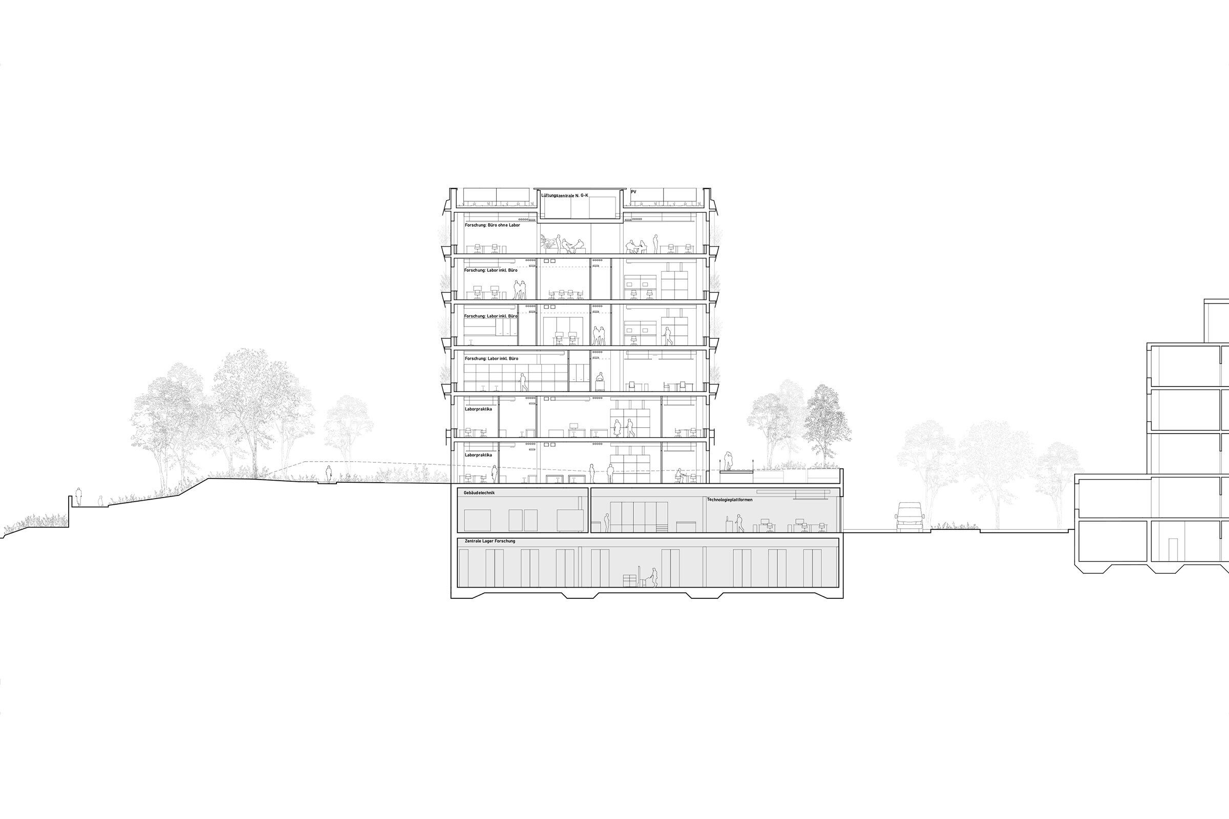 Das Laborgebäude Y51 nutzt das Potenzial einer starken Struktur auf ganz andere Art und Weise als das Lehrgebäude. Basierend auf einem hybriden Stahl-Beton-Gerüst ist es optimal auf die unterschiedlichen Nutzungsszenarien für Labor- und Büroausbauten abgestimmt. Ein Hauptkern, der an der Schnittstelle zwischen der Hauptnutzung und den Sozialräumen liegt, sowie zwei funktionale Nebenkerne determinieren die innere Struktur. Die Lage der Kerne erlaubt eine flexible Anordnung der Nutzflächen mit einer bestmöglichen natürlichen Belichtung. Die am Kopf situierten Sozialräume werden auf allen Geschossen durch einen jeweils mittig liegenden Diskursraum strukturiert.