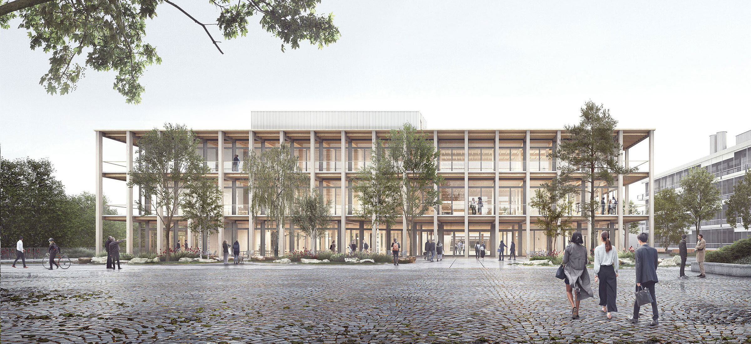 Die Differenzierung der beiden Bauten zeigt sich auch im architektonischen Ausdruck. Ein gemeinsamer Sockel aus Beton bildet die Basis und nimmt die Terrainunterschiede auf. Die hier etablierte tektonische Ordnung setzt sich in den Obergeschossen des Laborgebäudes Y51 fort, wo durchlaufende, begrünte Brüstungen im Wechsel mit Fensterbändern die horizontale Erscheinung des Baus prägen. Dazu im Kontrast steht das pavillonartige Lehrgebäude Y10, dessen raumhaltige Fassade den Bau leicht und offen in Erscheinung treten lässt. Die Obergeschosse verfügen über umlaufende Balkone, die einen Übergangsraum bilden und zum Verweilen und Arbeiten genutzt werden können. Die Holzstruktur gliedert die dreigeschossigen Fassaden, wobei die durchlaufenden Stützen die Vertikale betonen. Zusammen bilden die zwei Bauten ein Paar, das sich gegenseitig bedingt und stärkt, wobei jedes Gebäude eine eigene Gestalt aufweist.