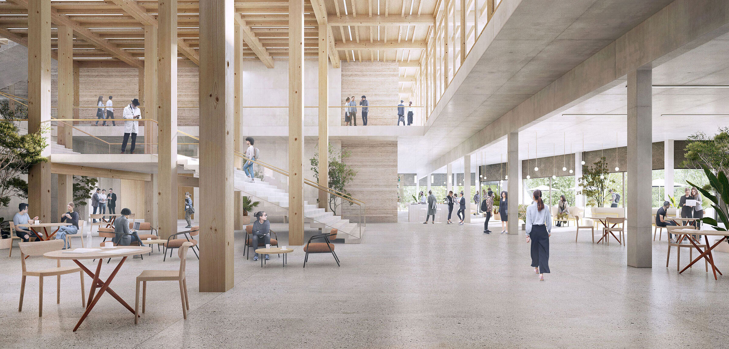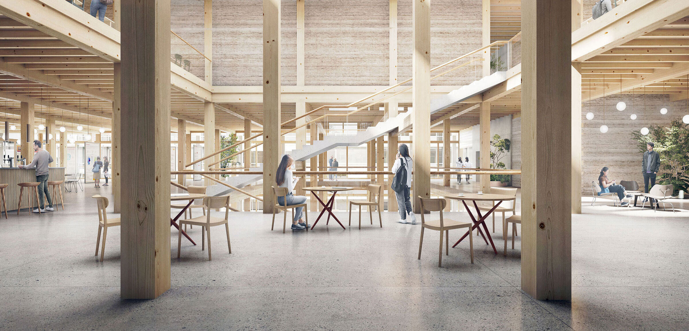 Basierend auf der programmatischen Vielfalt entwickelt sich in den beiden über einen gemeinsamen Sockel verbundenen Bauten eine jeweils eigenständige Raumkonzeption. Im Lehrgebäude Y10 bildet die sichtbare Holzkonstruktion eine offene, geschossübergreifende Struktur, die nebst einem vielfältigen Raumangebot auch ein hohes Mass an Transparenz aufweist. Kollektive und individuelle Lern- und Lehrsettings werden von Erholungs-, Informations- und Sozialbereichen ergänzt und bilden ein funktional und atmosphärisch dichtes Ganzes. Vom Eingangsgeschoss mit Restaurant und Laden führt eine einläufige Treppe runter in ein grosszügiges, gut belichtetes Foyer im Sockelgeschoss. Das Foyer bildet das Zentrum der kollektiven Räume und ermöglicht einen leistungsfähigen Betrieb der angelagerten Hörsäle und Diskursräume. Durch die lateral angeordnete Cafeteria wird es in seiner Funktion als Raum des sozialen Austauschs gestärkt und erfährt durch den Bezug zum umgebenden Naturraum eine zusätzliche Aufwertung. Die offene Raumstruktur findet in den beiden Obergeschossen ihre Fortsetzung. Dort liegen zwei weitere Hörsäle, das Science Lab sowie die Büro- und Arbeitsbereiche für Mitarbeitende und Studierende. Die Kombination der stabartigen Holzstruktur mit den kompakten Körpern aus Lehm prägt das Gebäudeinnere wesentlich.