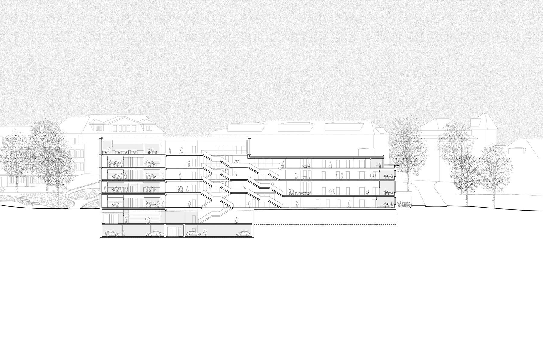 Ausgangspunkt der baukörperlichen Komposition ist die bestehende Poliklinik an der Hofstrasse. Sie schafft als historische Referenz weiterhin den Bezug zur ursprünglichen Nutzung des Areals. Der Neubau spreizt sich mit seinem zweiten Flügel auf und schafft durch die freie Setzung den Bezug zum nördlich gelegenen Infektionshaus und der Beobachtungsstation. Die enge baukörperliche Verflechtung von denkmalgeschützter Poliklinik und Neubau verlangt eine differenzierte, aufeinander abgestimmte Ausformulierung der Fassaden. Dabei wird die, der klassischen Moderne verpflichtete Sprache Salvisbergs im Neubau durch eine ruhige, seriell aufgebaute Fassade ergänzt.